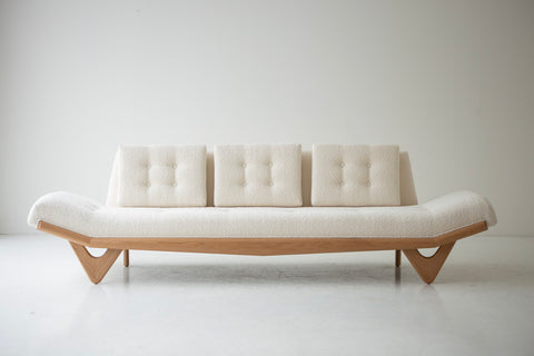 This modern sofa is expertly crafted and upholstered. The sofa boasts hand cut high-density foam and commercial grade mohair. The sofa's frame and base are constructed from a combination of bent plywood and solid hardwood and copper by hand; not from a machine. The walnut legs are then shaped by artisans and finished with a hand applied oil OR commercial grade finish.