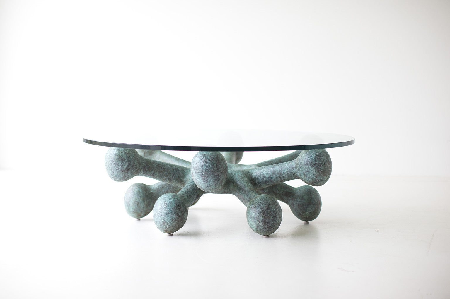 This modern bronze coffee table is expertly crafted. The base is constructed by artisans who hand-weld and hand-patina each piece. The top is 3/4" glass with a standard 48" diameter, but the base can accommodate a much larger piece of glass.