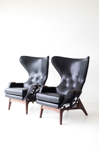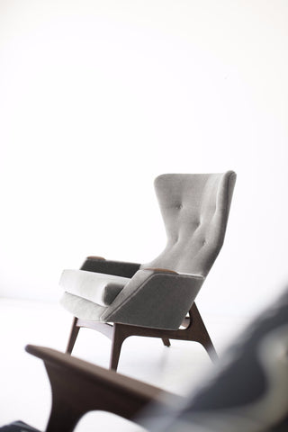 These small wing chairs are expertly crafted and upholstered. These wing chairs represents the smallest wing chair of our collection. Each chair boasts hand cut foam and commercial grade fabric. The chair's frame and base are constructed by hand from hard wood and not machine. The walnut base is then shaped by artisans and finished with a hand applied oil.