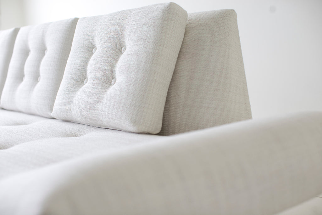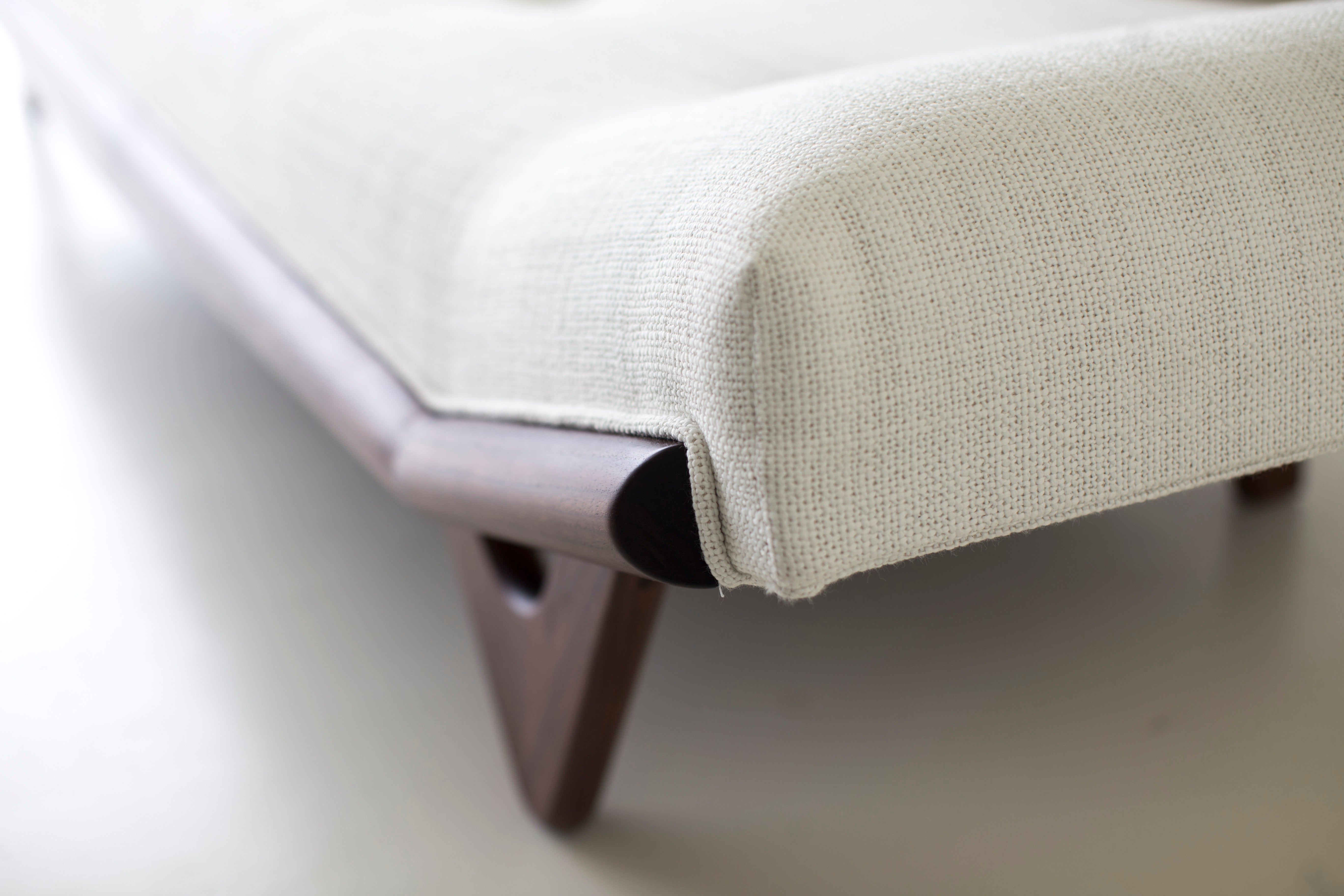 This modern sofa is expertly crafted and upholstered. Each sofa boasts hand cut high-density foam and high grade commercial fabric. The sofa's frame and base are constructed from hardwood by hand, not machine. The walnut base is then shaped by artisans and finished with a hand applied oil OR commercial grade finish.