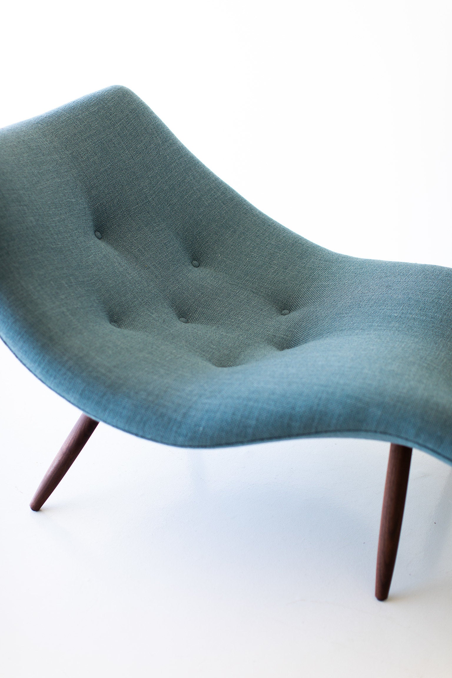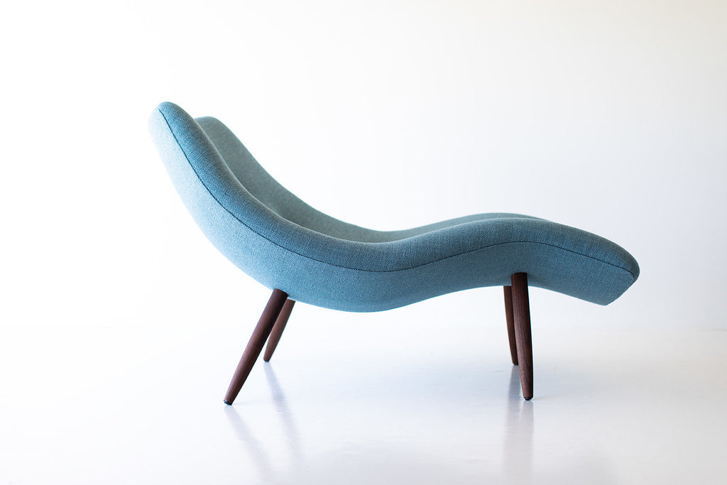 This modern chaise is expertly crafted and upholstered. The chaise boasts hand cut high-density foam and thick weave fabric. The chaise's frame is constructed by hand from a combination of wood and steel bracing. This is not made from a machine. The walnut legs are then shaped by artisans and finished with a hand applied oil OR commercial grade finish.