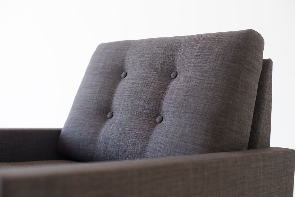 These modern club chairs are expertly crafted and upholstered. Each chair boasts hand cut high-density foam and high grade commercial fabric. The chair's frame and base are constructed from hardwood by hand, not machine. The walnut base is then shaped by artisans and finished with a hand applied oil OR commercial grade finish.