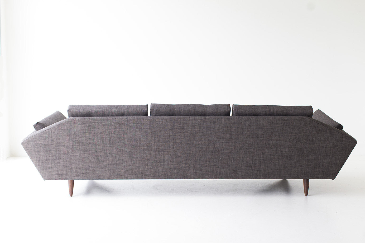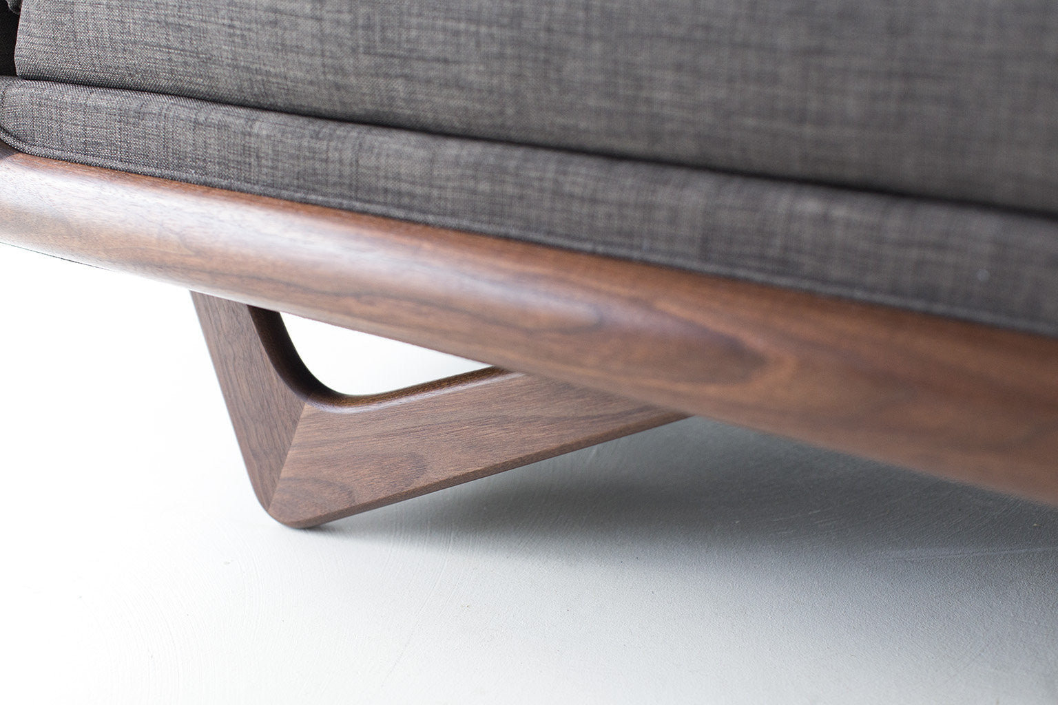 This modern sofa is expertly crafted and upholstered. Each sofa boasts hand cut high-density foam and high grade commercial fabric. The sofa's frame and base are constructed from hardwood by hand, not machine. The walnut base is then shaped by artisans and finished with a commercial grade finish.