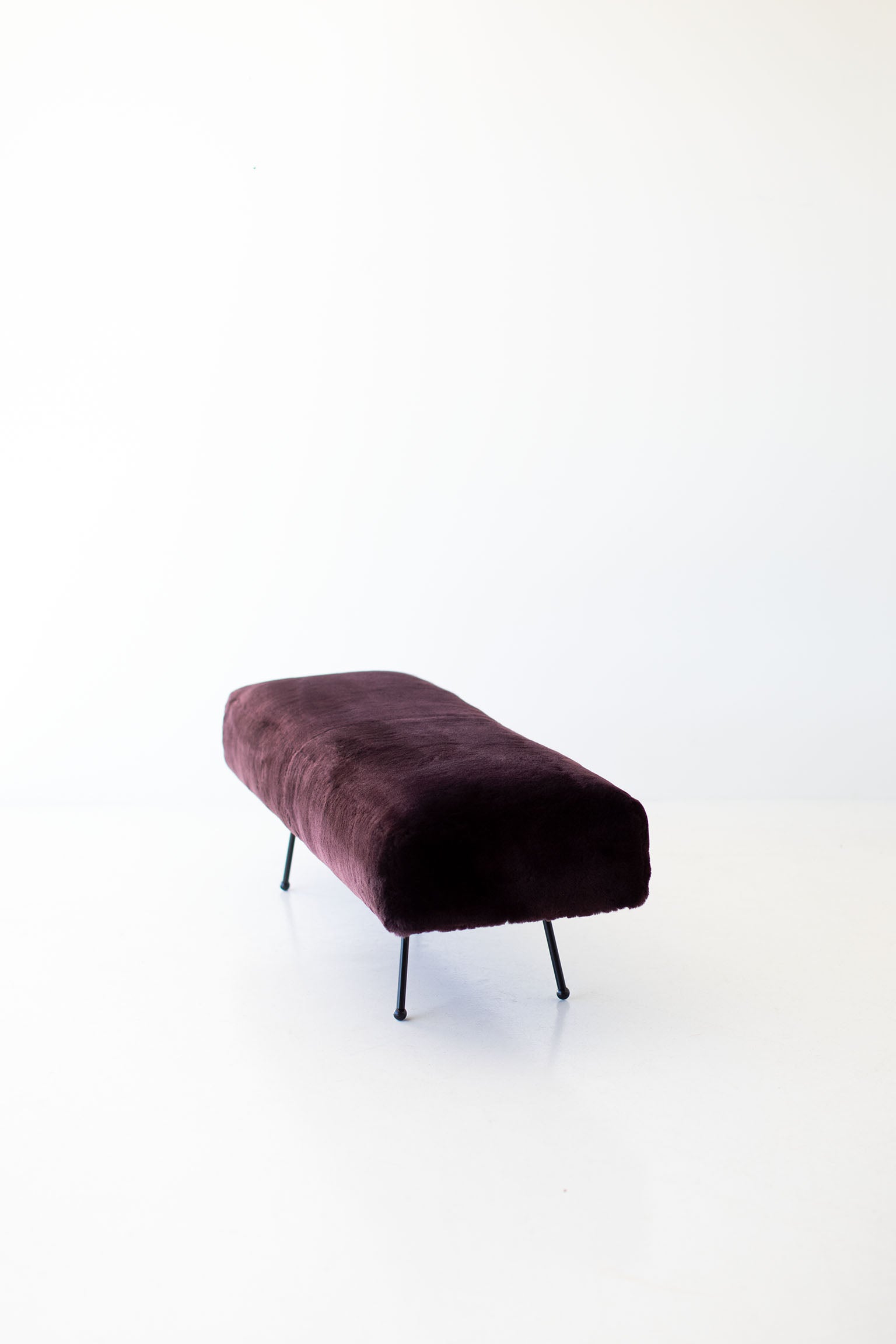 This modern fur bench is expertly crafted and upholstered. The bench boasts hand cut high-density foam and commercial grade fabric (linen shown here). The base is constructed by hand from a combination of bent wrought iron and solid hard wood; not from machine. The wrought iron legs are then shaped by artisans and finished by powder coating.
